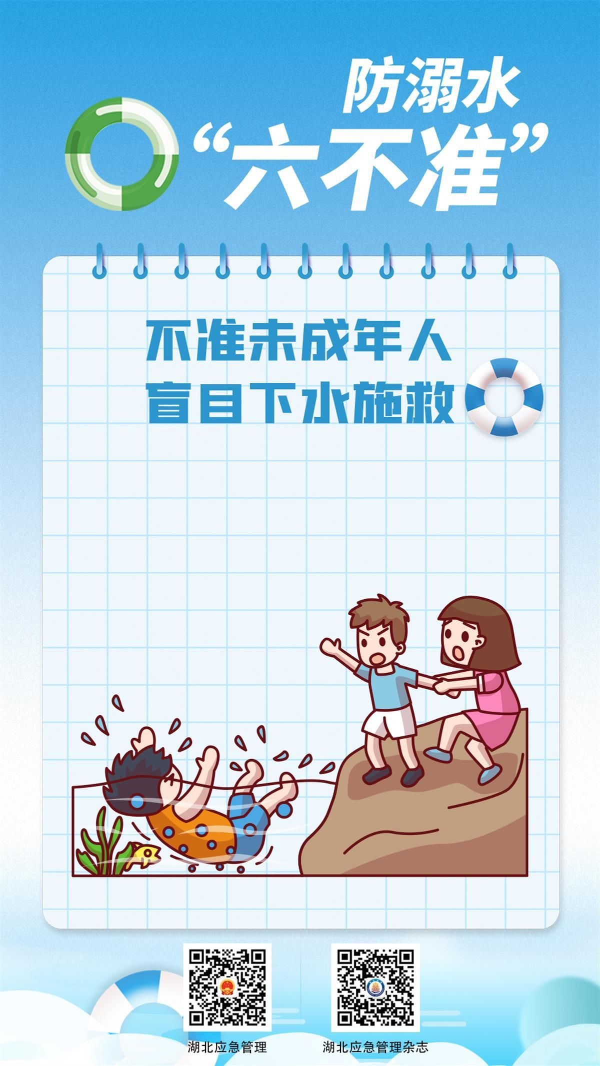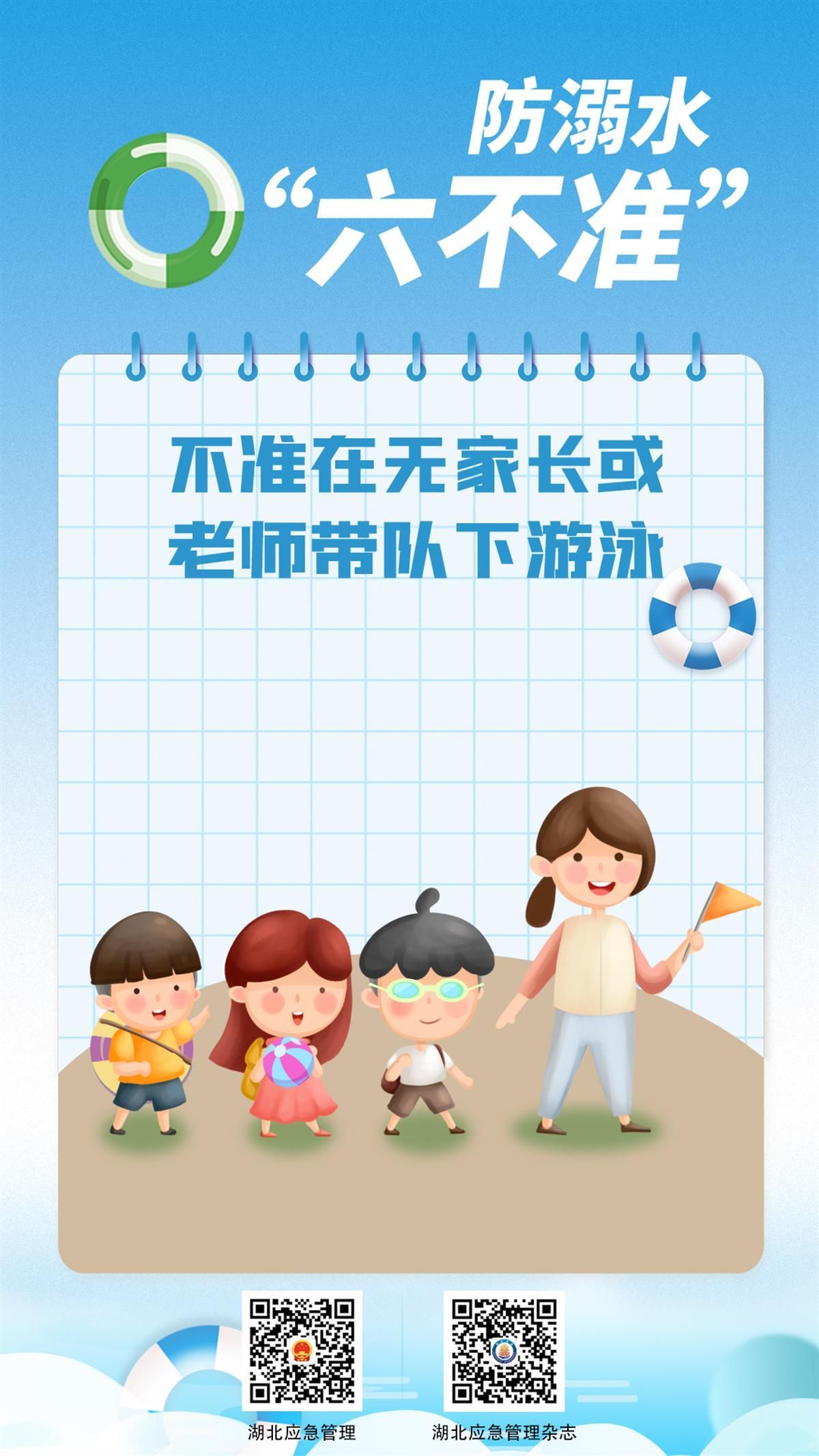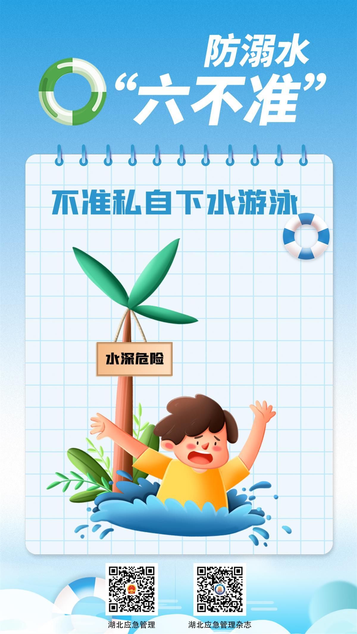 如何避免悲劇發(fā)生?7月8日,湖北省應(yīng)急管理廳發(fā)布系列海報(bào),提醒學(xué)生防溺水應(yīng)做到“六不準(zhǔn)”:不準(zhǔn)私自下水游泳;不準(zhǔn)擅自與他人結(jié)伴游泳;不準(zhǔn)在無家長或教師帶領(lǐng)的情況下游泳;不準(zhǔn)到無安全設(shè)施、無救援人員的水域游泳;不準(zhǔn)到不熟悉的水域游泳;不準(zhǔn)未成年人擅自下水施救。