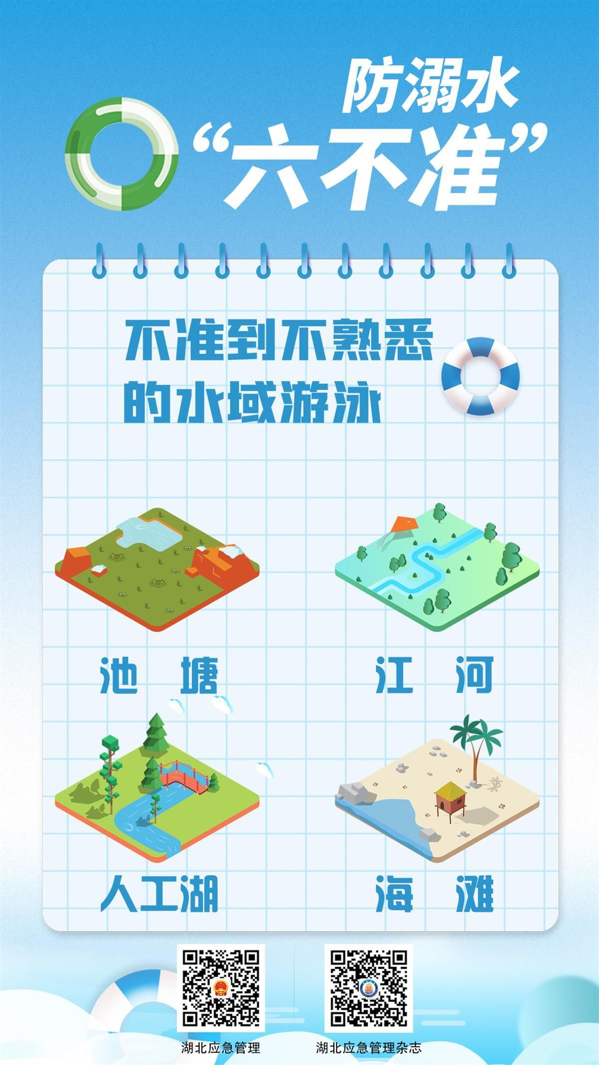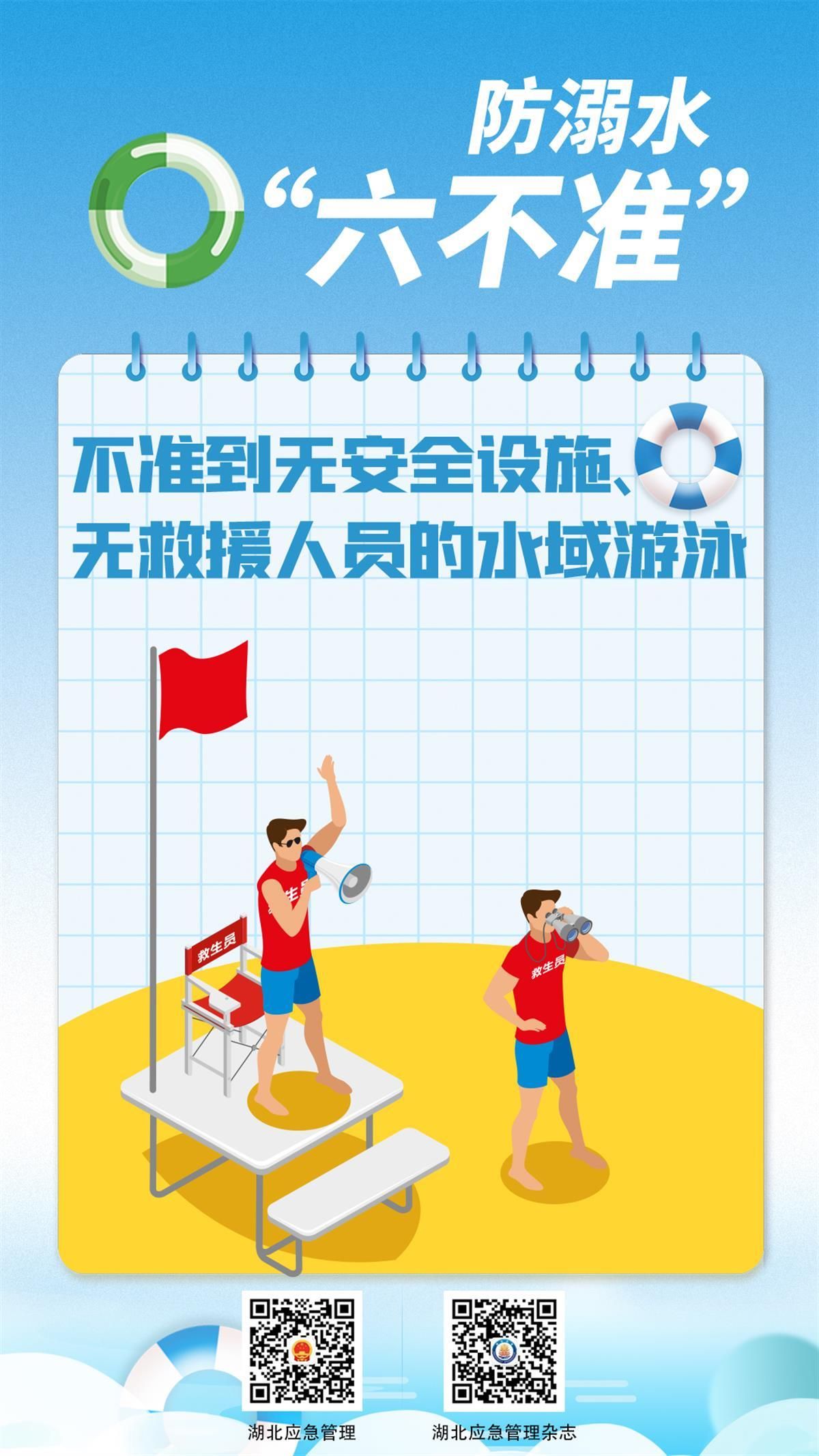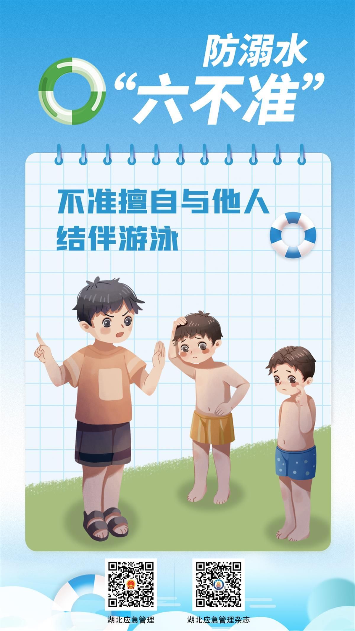 如何避免悲劇發(fā)生?7月8日,湖北省應(yīng)急管理廳發(fā)布系列海報(bào),提醒學(xué)生防溺水應(yīng)做到“六不準(zhǔn)”:不準(zhǔn)私自下水游泳;不準(zhǔn)擅自與他人結(jié)伴游泳;不準(zhǔn)在無家長或教師帶領(lǐng)的情況下游泳;不準(zhǔn)到無安全設(shè)施、無救援人員的水域游泳;不準(zhǔn)到不熟悉的水域游泳;不準(zhǔn)未成年人擅自下水施救。