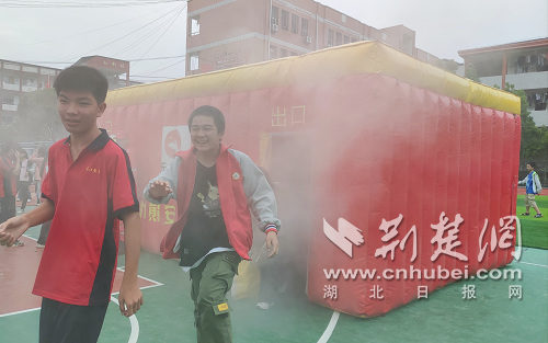 “發(fā)生火災后,正確佩戴面罩,會為逃生贏得寶貴時機,但戴面罩時一定要記得取掉蓋子,確保能正常呼吸?!?3日上午,防災減災科普主題“應急演練”在馬港中學操場開展。當天8時30分許,應急演練活動正式開始,該校100多名中學生圍著操場站成一圈,與來自無憂熊安全教育機構的老師們現場互動熱身。通過老師講解應急包、滅火器的使用,模擬火災后如何穿越濃煙逃生等等,學生進一步了解了安全應急知識,并學會正確使用、佩戴安全裝備。