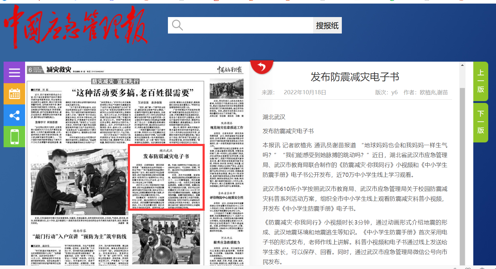 武漢市610所小學(xué)按照武漢市教育局、武漢市應(yīng)急管理局關(guān)于校園防震減災(zāi)科普系列活動(dòng)方案,組織全市中小學(xué)生線上觀看防震減災(zāi)科普小視頻,并發(fā)布《中小學(xué)生防震手冊》電子書。
