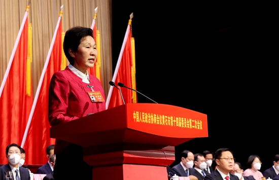 周蔚芬作《中國人民政治協(xié)商會議黃石市第十四屆委員會常務委員會工作報告》。阮瓊 攝