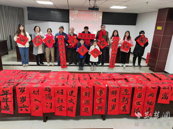 1月6日,黃石鎖前社區(qū)新時代文明實踐站組織黨員、書法愛好者們和居民們一起,開展“對聯(lián)迎新春 廉潔過兔年”活動。