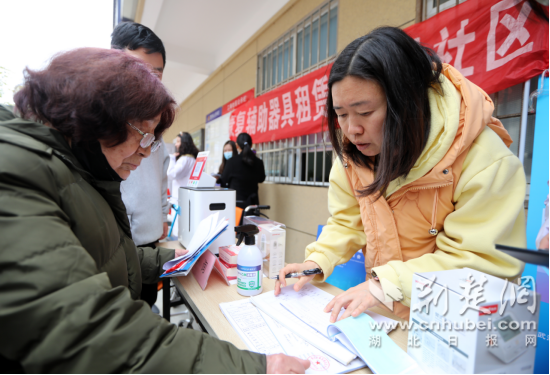 在武漢關(guān)東街道江南社區(qū)一困難老人家中,老人正高興地聆聽康復(fù)輔助器具惠民租賃政策。