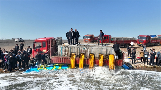 活動現(xiàn)場,一輛輛滿載魚苗的大型貨車有序駛向江邊,工作人員爬上車,用撈魚網(wǎng)舀起魚苗認真察看,隨后打開裝魚苗的容器,不同種類的魚苗沿著放置的斜面傾瀉,伴著晶瑩的水花,四散游向更遠處。