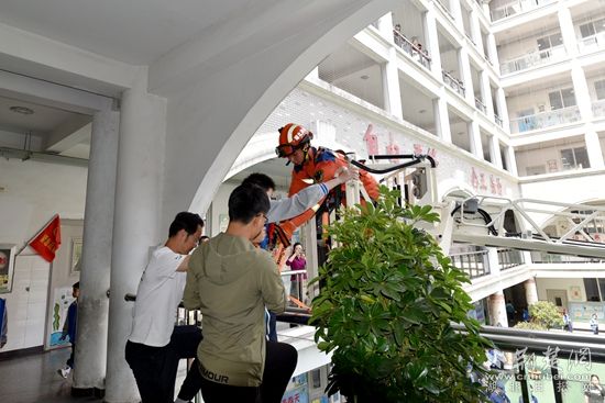 “火災(zāi)”發(fā)生后,學(xué)校立即啟動應(yīng)急疏散預(yù)案:由老師組織學(xué)生有序疏散、安保人員進(jìn)行初期火災(zāi)撲救,同時撥打119電話報警。消防人員到場后迅速開展滅火救援,并利用云梯消防車成功解救兩名行動不便的被困高樓層的學(xué)生。
