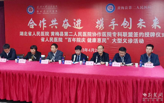 荊楚網(wǎng)(湖北日報(bào)網(wǎng))訊(通訊員劉學(xué)平)4月23日,湖北省人民醫(yī)院和黃梅縣第二人民醫(yī)院(孔壟鎮(zhèn)衛(wèi)生院)協(xié)作醫(yī)院專科聯(lián)盟簽約授牌暨省人民醫(yī)院“百年院慶 健康惠民”大型義診活動在黃梅縣孔壟鎮(zhèn)舉行。