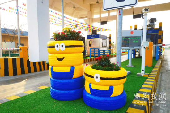 盡覽服務(wù)區(qū)文化風(fēng)光的同時(shí),湖北收費(fèi)站同樣不遑多讓。隨岳高速鹿頭收費(fèi)站上方懸掛了無(wú)數(shù)藍(lán)色小燈泡,夜間猶如點(diǎn)點(diǎn)閃爍的“星光”,吸引不少游客在此拍照“打卡”。隨岳高速洋梓收費(fèi)站在運(yùn)用了“彩虹車道”的基礎(chǔ)上,充分利用低成本的廢舊輪胎、小木板、線型燈帶進(jìn)行網(wǎng)紅造景,一件件生機(jī)勃勃的“藝術(shù)品”在安全島頭“閃亮登場(chǎng)”。