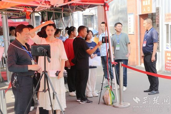 現(xiàn)場,考生排著整齊的隊伍,接受考點身份驗證及安檢檢查,陸續(xù)步入考場。