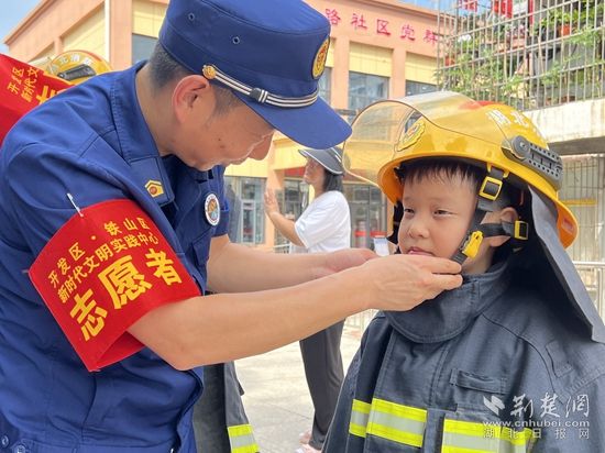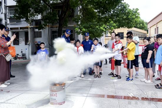 消防員從滅火器的基本原理,到使用步驟,“拔下插銷,握住軟管,噴嘴對準火焰根部……”一步步教孩子們?nèi)绾握_使用滅火器,并讓孩子們進行實際操作。現(xiàn)場,消防員還為孩子們講解了有關消防車輛裝備及器材的用途,孩子們爭先恐后穿上戰(zhàn)斗服,體驗當一回“小小消防員”。