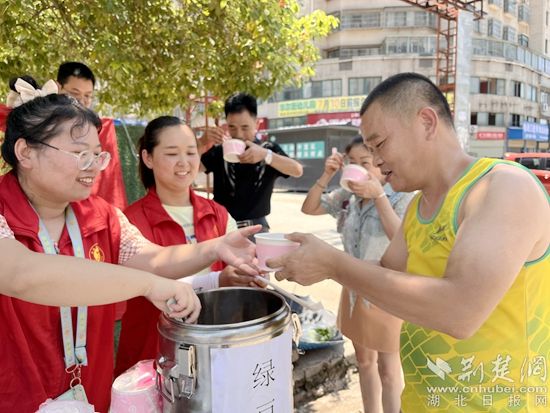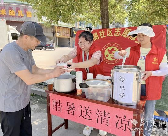 活動(dòng)現(xiàn)場,社區(qū)工作人員在菜市場路口提前設(shè)置好清涼桌,將準(zhǔn)備好兩大桶的綠豆湯和涼茶,發(fā)放給高溫下的工作者和路過的居民。同時(shí),為他們科普防暑降溫知識(shí),叮囑他們注意休息和避暑。