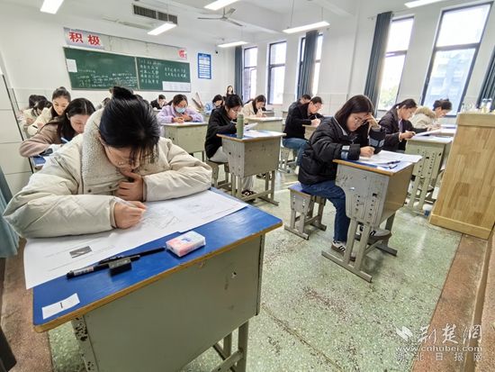 當(dāng)天早上8時許,記者來到黃石城區(qū)考點——黃石十六中。只見黃石各直屬高中的書記、校長在校門口為前來“趕考”的教師加油鼓勁。記者注意到,參加考試的教師當(dāng)中,還包括了部分學(xué)校的副校長、主任等管理人員。