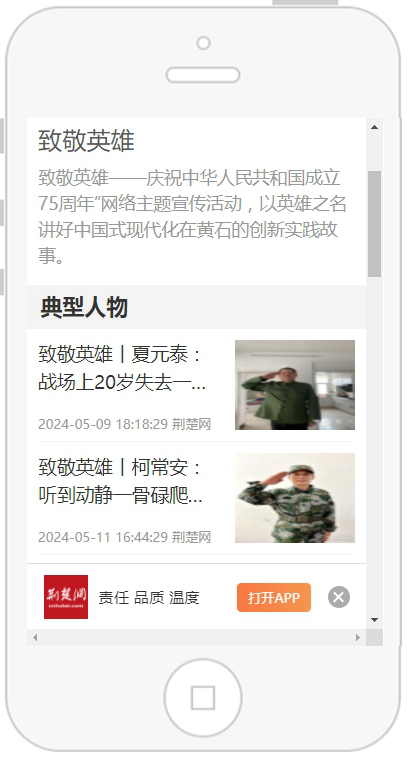 為向歷史開掘精神資源,營造崇尚英雄、學習英雄、關(guān)愛英雄的濃厚氛圍,黃石市委網(wǎng)信辦、市退役軍人事務(wù)局聯(lián)合荊楚網(wǎng)(湖北日報網(wǎng))啟動《致敬英雄》大型網(wǎng)絡(luò)專題宣傳。