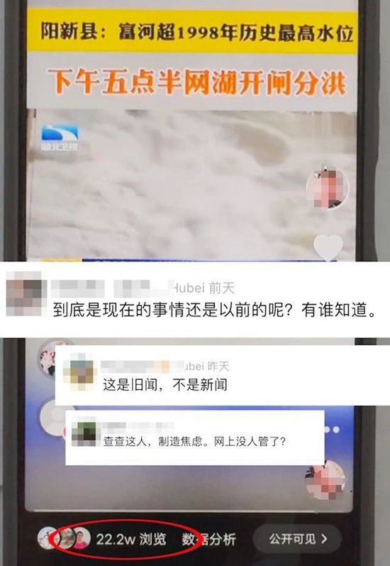 該視頻一經(jīng)發(fā)布,立即引起了廣大網(wǎng)民的關(guān)注和擔(dān)憂(yōu),誤導(dǎo)網(wǎng)民認(rèn)為發(fā)生了洪災(zāi)險(xiǎn)情。相關(guān)視頻發(fā)布后瀏覽量達(dá)22.2萬(wàn)人次,在一定程度上引發(fā)了公眾恐慌。