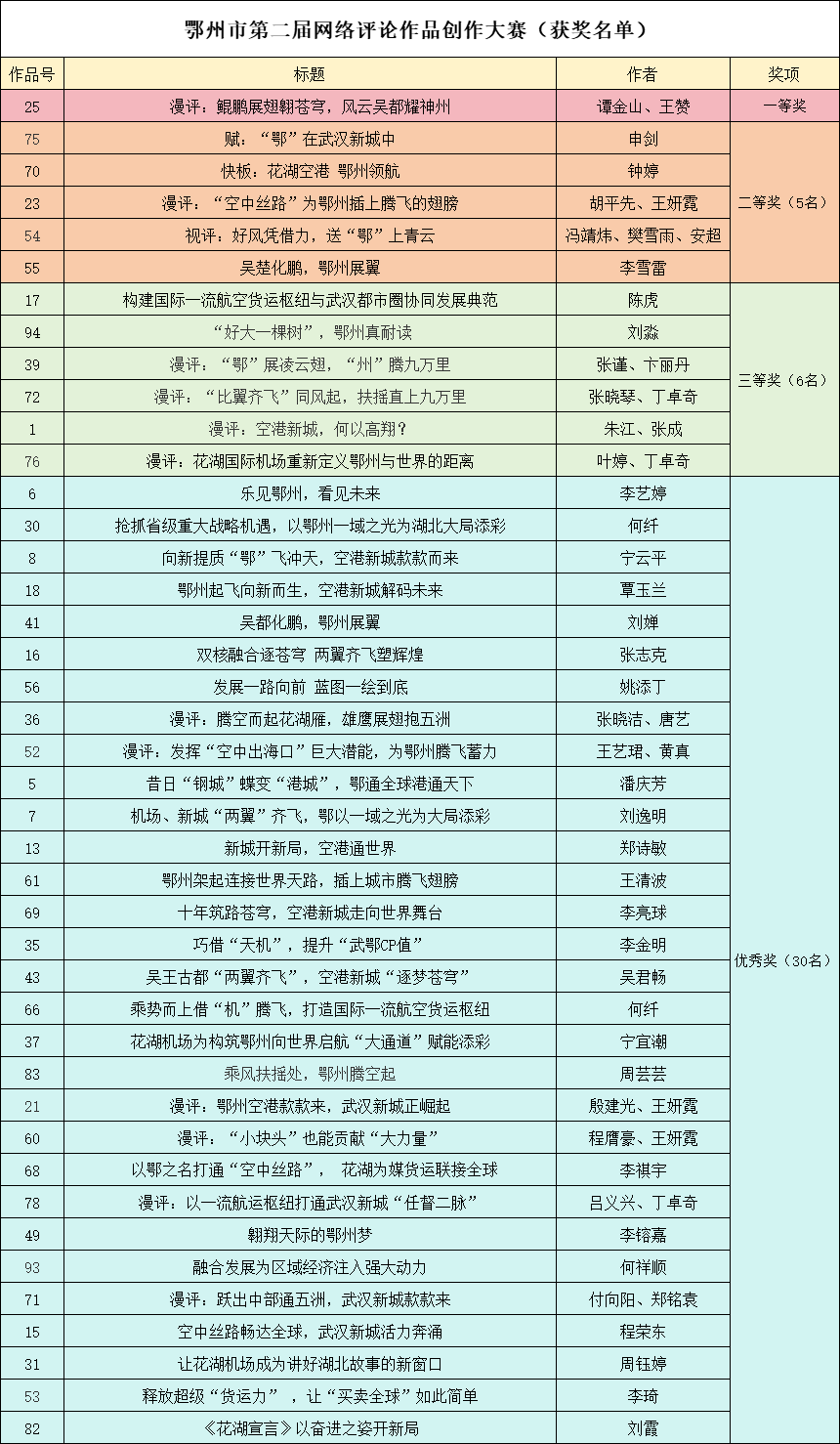 據(jù)了解,本次大賽于2024年6月15日啟動(dòng),由中共鄂州市委宣傳部、鄂州市委網(wǎng)信辦、荊楚網(wǎng)(湖北日?qǐng)?bào)網(wǎng))主辦,楚天網(wǎng)絡(luò)評(píng)論研究院、荊楚網(wǎng)鄂東編輯部承辦。經(jīng)過5個(gè)月的征集,共收到來自全國(guó)各地200多篇作品,其中優(yōu)秀作品在荊楚網(wǎng)東湖評(píng)論平臺(tái)發(fā)布。