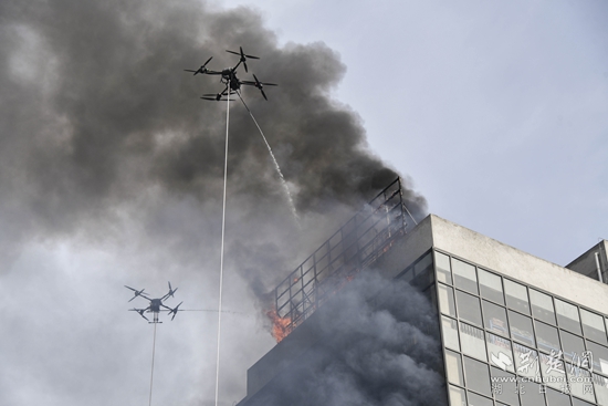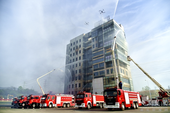 在滅火救援過程中,黃石消防首次設(shè)置無人機(jī)滅火科目,配合云梯車人員疏散、火場緊急避險、高層供水、內(nèi)部攻堅等實戰(zhàn)化內(nèi)容,向參會人員展示了黃石市消防救援隊伍建設(shè)成效。