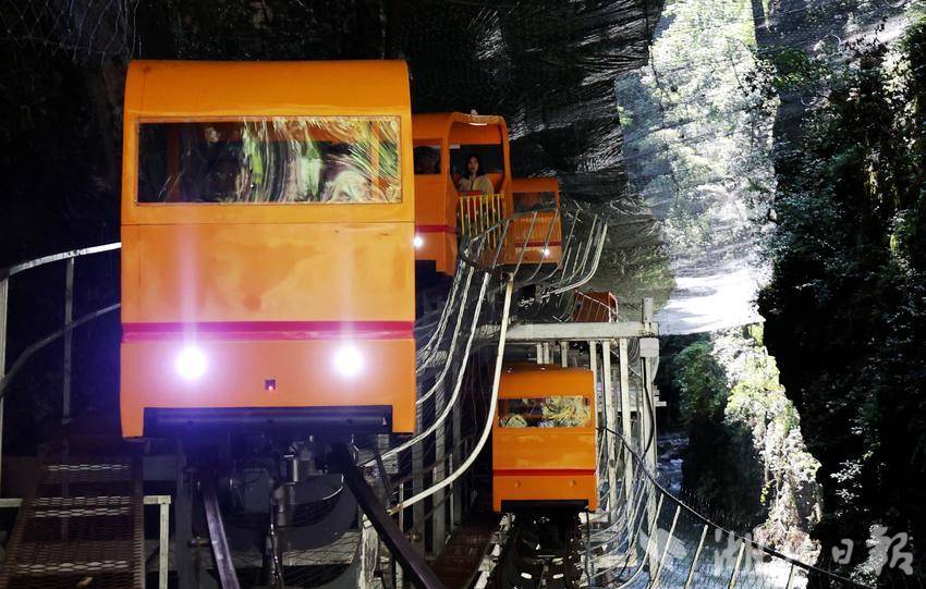 在這里,將開啟一場2400米的云端地心之旅——車窗化作天然IMAX銀幕,飛瀑在腳下碎成鉆石雨,巖層紋路里凝固著遠(yuǎn)古海浪,霧氣中突然探頭的彩虹帶來驚喜;200米落差間,軌道車以恰到好處的速度穿梭,每個轉(zhuǎn)彎都成為與石壁的驚鴻一吻,13分鐘航程里腎上腺素與視覺震撼同步飆升。