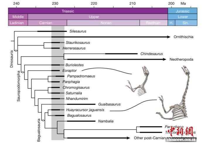 該論文介紹,晚三疊世(約2.37億-2.01億年前)的生態(tài)系統(tǒng)發(fā)生了急劇變化,導(dǎo)致恐龍、哺乳動(dòng)物的早期近親以及包括鱷魚(yú)在內(nèi)的動(dòng)物種群崛起和分化??铸?jiān)缙谘莼脑S多證據(jù)都發(fā)現(xiàn)于南美,大部分關(guān)鍵發(fā)現(xiàn)局限于阿根廷和巴西的兩個(gè)盆地地區(qū)。