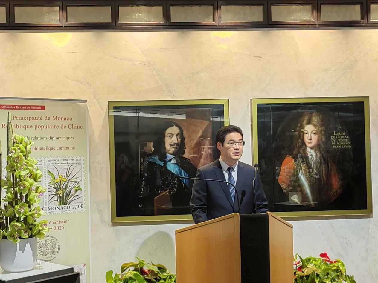 何有麟在致辭中指出,紀念郵票以中國春蘭和摩納哥風鈴草并蒂成圖,體現(xiàn)了雙方在生態(tài)保護和可持續(xù)發(fā)展等方面的共同理念,象征兩國人民的深厚友誼。