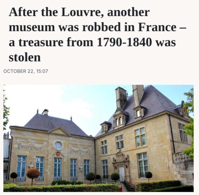 中新網(wǎng)10月23日電 據(jù)外媒當(dāng)?shù)貢r(shí)間22日?qǐng)?bào)道,在巴黎盧浮宮博物館發(fā)生搶劫案后不久,法國另一家小型博物館失竊,約2000枚金幣和銀幣被盜。事發(fā)后該博物館暫時(shí)關(guān)閉。