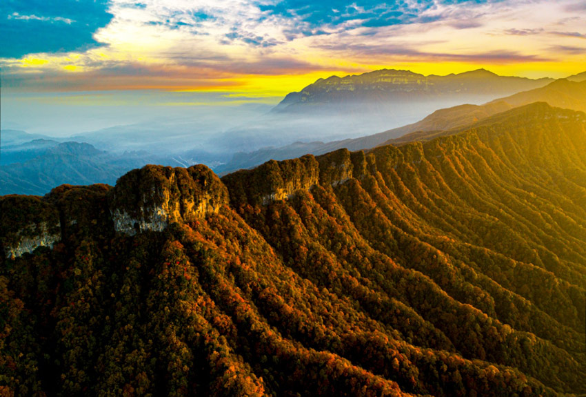 光明璀璨,霧象萬千。光霧山,地處中國南北氣候分界線,獨(dú)特的地理位置和復(fù)雜多變的山地氣候,孕育了極其豐富的植物群落。每當(dāng)深秋時節(jié),寒意浸染,以巴山水青岡、槭樹、黃櫨等為主的680平方公里彩林,便奏起了生命的華彩樂章。色彩從山頂向山谷層層浸染,緋紅、橙紅、霞紅、金紅、絳紫……各種紅色交織疊加,如巨幅油畫,似流霞滿天,其面積之廣闊、色彩之斑斕、層次之分明、觀賞期之綿長,構(gòu)成了“亞洲最長紅地毯”的驚世之美,堪稱自然造物的奇跡。