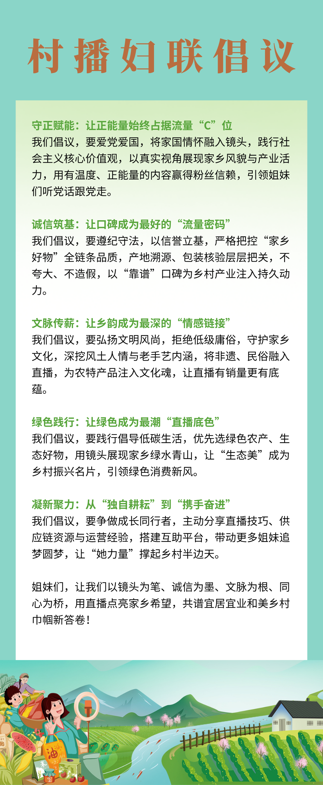 五位村播婦聯(lián)代表共同發(fā)出倡議,以“守正賦能”錨定方向、“誠信筑基”堅(jiān)守底線、“文脈傳薪”延續(xù)根脈、“綠色踐行”繪就底色、“凝新聚力”共赴新程,號(hào)召全國的女主播們堅(jiān)守初心使命,凝聚巾幗合力,用直播點(diǎn)亮家鄉(xiāng)希望,以實(shí)干擔(dān)當(dāng)共譜和美鄉(xiāng)村巾幗新答卷。