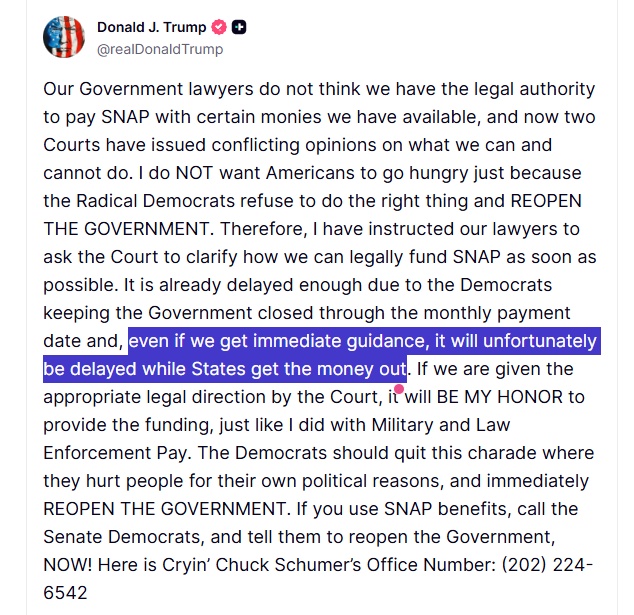 按照特朗普的最新表態(tài),“即便得到了明確的法律指引,各州的資金發(fā)放仍然會(huì)被推遲”。有美國媒體分析認(rèn)為,盡管法官作出了恢復(fù)“補(bǔ)充營養(yǎng)援助計(jì)劃”的裁決,但資金從撥付到具體落地,仍然需要經(jīng)歷一系列法律與行政流程,因此4200萬美國人的基本食物供應(yīng)難題可能會(huì)從11月開始持續(xù)一段時(shí)間。