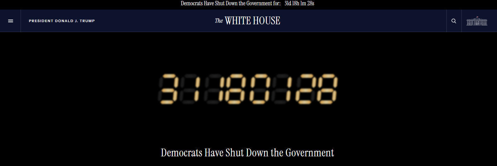截至美東時(shí)間11月1日18時(shí)(北京時(shí)間11月2日6時(shí)),美國白宮官網(wǎng)實(shí)時(shí)刷新紀(jì)錄的這次美國政府“停擺”已經(jīng)持續(xù)了31天零18個(gè)小時(shí)。在白宮官網(wǎng)的頁面上,寫有“民主黨人關(guān)停了政府”的字樣。