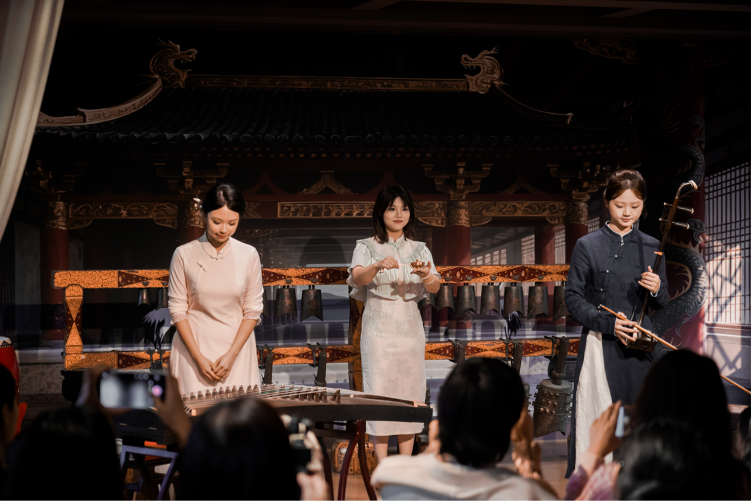 在荊州博物館的場域里,湖北第二師范學(xué)院美育團(tuán)隊(duì)帶來的“文人雅韻”篇章,更落地了“人人美育,美育人人,美育浸潤,培根鑄魂”的理念:一方面,書法的枯潤濃淡與樂器技法呼應(yīng)——《寒食帖》里二胡長音摹寫“破灶”筆觸,《松風(fēng)閣》中琵琶輪拂復(fù)刻松濤筆勢;另一方面,荊州博物館助力還原的宋代“嬰香”(依《陳氏香譜》復(fù)原)、編鐘紋飾拓片、三帖高仿復(fù)本,讓觀眾在“視聽嗅觸”中觸摸文物與書法的溫度,文物不再是玻璃后的靜物,而是美育的鮮活教材,更是文博資源與美育理念的共生,在文博與藝術(shù)的碰撞里讓荊楚文化的“根”,扎得更深。
