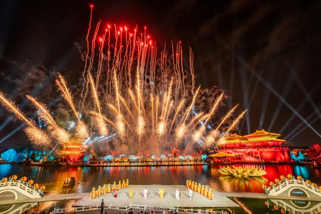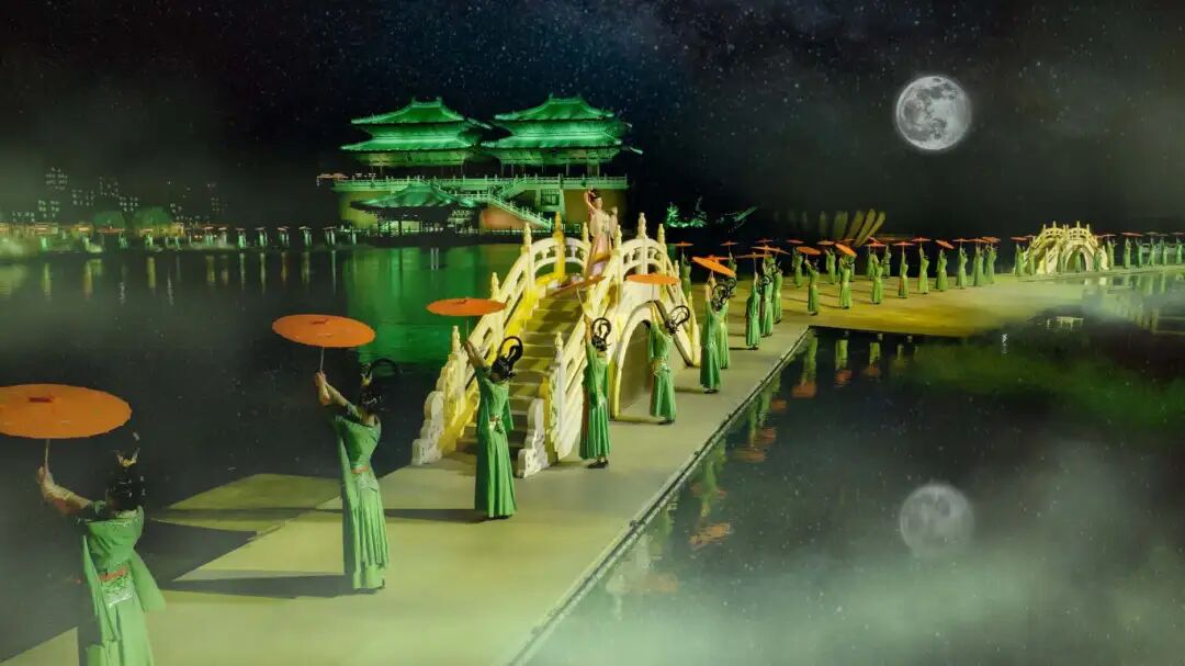 大型水上實景演出《大宋·東京夢華》由清明上河園斥巨資打造,充分利用皇家園林區(qū)景龍湖附近的亭臺樓閣、水榭橋廊構(gòu)成一個完整的古典實景劇場。