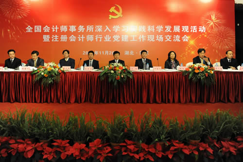 11月26日,財政部會計師事務所深入學習實踐科學發(fā)展觀活動指導小組、中國注冊會計師行業(yè)黨委在湖北省武漢市召開全國會計師事務所深入學習實踐科學發(fā)展觀活動暨注冊會計師行業(yè)黨建工作現(xiàn)場交流會,深入學習貫徹黨的十七屆四中全會精神,總結各省市區(qū)會計師事務所學習實踐活動和行業(yè)黨建工作做法,交流經驗,探討方法,凝聚共識,更加扎實有效地推進會計師事務所學習實踐活動和行業(yè)黨建工作。財政部黨組成員、副部長、財政部會計師事務所深入學習實踐科學發(fā)展觀活動指導小組副組長、中國注冊會計師行業(yè)黨委書記王軍,湖北省委常委、常務副省長李憲生出席會議并講話。