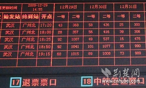 12月29日下午2時55分前后,記者在武漢站售票大廳看到,每10分鐘刷新一次的售票余額大屏幕顯示,?吭谡九_上即將于15時30分發(fā)車的G1045次列車,一等票剩111張、二等票剩716張,按照雙聯(lián)8節(jié)車廂、1200個座位計(jì)算,銷售車票350張左右,上座率三成左右。